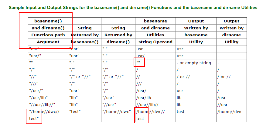 | Description | The page for basename contains a table with examples. The table has a border and separating lines between the cells. Some of these lines go straight through what should be a single cell. The headings are split into 4 rows each, but that should be 1 row. The last example is split over 2 rows. Does the last example really contain a line break in the pathname? | ||||