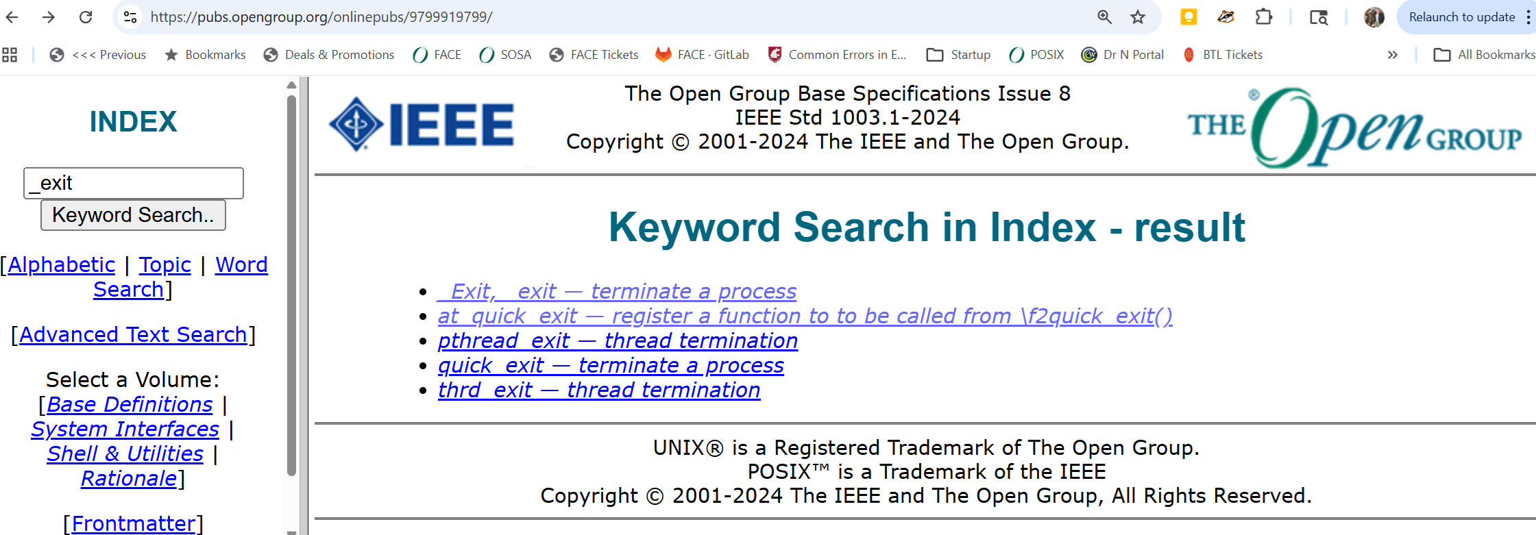 | Description | When searching for _exit at https://pubs.opengroup.org/onlinepubs/9799919799/, the search results pane shows these results: _Exit, _exit — terminate a process at_quick_exit — register a function to to be called from \f2quick_exit() pthread_exit — thread termination quick_exit — terminate a process thrd_exit — thread termination Notice the "\f2" before quick_exit() on line 2. This error does not appear on the linked to page for quick_exit(). | ||||